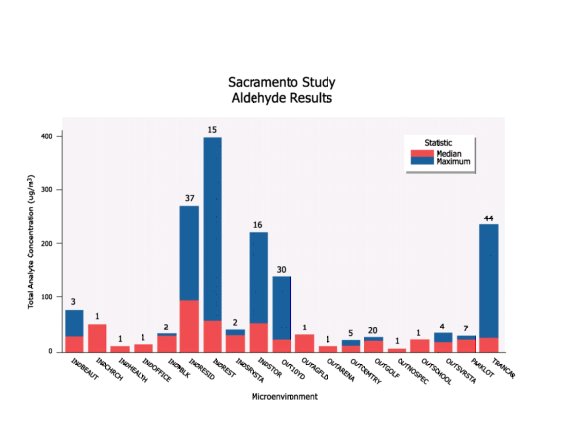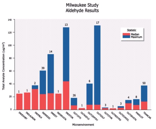 Tables 1 and 2 show a breakdown of analytes for both cities in a high-exposure microenvironment (see Table 1, restaurant), and a much lower exposure microenvironment (see Table 2, outdoors within 10 yards of a street). The data of Table 1 show similar aldehydes in both cities, yet much higher concentrations of acetaldehyde measured in Sacramento restaurants as compared to those in Milwaukee; acetaldehyde and formaldehyde are responsible for the majority of the total concentrations. Acetaldehyde is the initial metabolite of ethanol and is likely exhaled by individuals drinking alcohol. It also is known that various aldehydes are produced as a result of deep-frying foods or cooking foods in hot oil, as in stir fry. Table 2 shows that aldehydes also were higher in Sacramento than in Milwaukee at outdoor locations near a street. The significance of these differences will be examined more closely in future work.