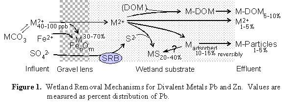 The low HRTs have resulted in aerobic conditions in these wetlands. Sulfide is not evolved, nor is sulfate significantly removed, and measurements of redox potential and dissolved oxygen in both the bulk and pore water confirm a largely aerobic condition throughout the columns. Therefore, sulfide precipitation is not a significant removal mechanism. The other two removal mechanisms, adsorption and iron oxyhydroxide coprecipitation, are active. Given that iron oxyhydroxide coprecipitation does not remove all lead and zinc, adsorptive breakthrough is anticipated at some point. This breakthrough is becoming apparent, as shown in Figure 3.