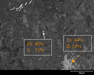 Figure 2. SEM Showing Lead and Iron Sulfides, Molecular Composition Determined via EDS