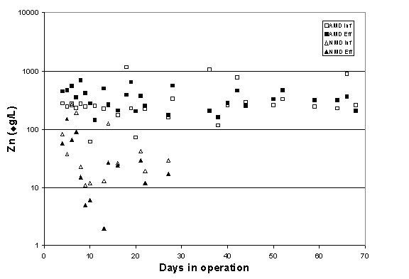 As an extension of the work on efficacy and failure modes, an acid mine drainage wetland was started in April 2002, in parallel to a new lead mine drainage system and a negative control receiving distilled water. Although these wetlands were designed to grow plants for bioavailability testing, the metal removal performance, shown in Figure 4, is of interest. The acid mine drainage system generally is losing zinc rather than removing this metal (Ceffluent > Cinfluent). The neutral mine drainage system is performing as expected. Presumably, the mix of metals in the synthetic acid mine drainage at pH 3.5 prevents the removal of zinc. The plants are, however, growing well in this wetland.