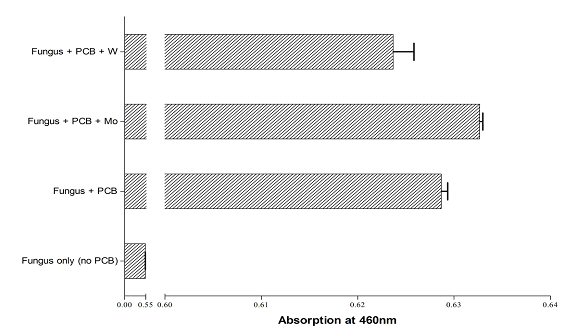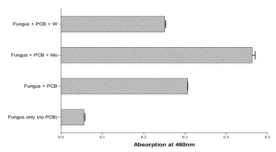 The inducible NR enzyme was shown to mediate PCB dechlorination in experiments using white-rot-fungi (Phanerochaete chrysosporium) and confirmed using pure NR enzyme (Sigma-Aldrich, USA). NR requires molybdenum (Mo) and iron as cofactors to promote reductive dechlorination, though tungsten (W) acts as a competitive inhibitor to retard the dechlorination process. Results are shown in Figures 1-3.