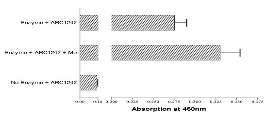 Figure 3. PCB Chlorine Release Assay Using Pure NR Enzyme. This chart shows chlorine release from 1,000 ppm Aroclor 1242 by pure NR enzyme with or without added Mo. The bars represent free Cl- measured at A460 (N = 3; mean ± SE).