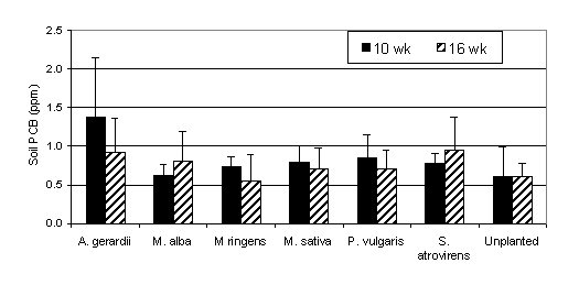 Unamended PCB-contaminated soil was placed in a 6" plastic pot and planted with a single plant for each planted treatment, including: alfalfa (Medicago sativa), big bluestem (Andropogon gerardii), green bulrush (Scirpus atrovirens), monkeyflower (Mimulus ringens), switchgrass (Panicum virgatum), and white mulberry (Morus alba). Five pots of each planted and unplanted control treatments were sacrificed at 10 and 16 weeks after planting. Over the course of the study, pots were watered as needed, fertilized with standard nutrients weekly, and kept weed-free.