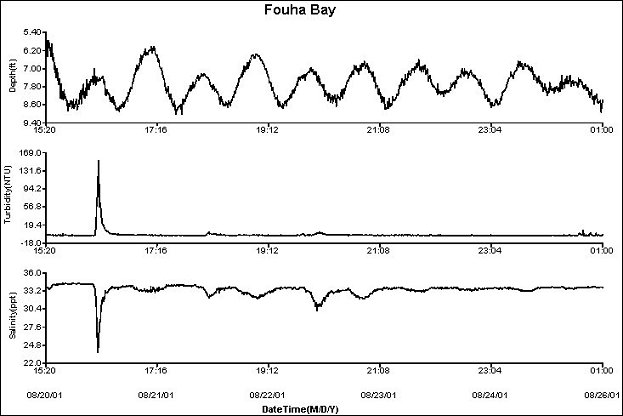 Physical Oceanography. Field experiments were carried out in Fouha Bay, Guam (no mangroves) and in Ngerikill Bay, Palau, a mangrove-mediated area. In both bays, five oceanographic moorings were deployed at sites along a transect from inshore (near the river mouth) to offshore for two weeks in July-August 2001 (Guam) and March - April 2002 in Palau. Salinity, temperature, and suspended sediment concentration (SSC) were measured using self-logging Analite nephelometers, DataFlow salinometers and a YSI self-logging CTD-cum nephelometer. The salinometers and nephelometers were deployed at nominal depths from 1 meter to 3 meters. The vertical profiles of horizontal currents were measured using a bottom-mounted Workhorse Acoustic Doppler Current Profiler.