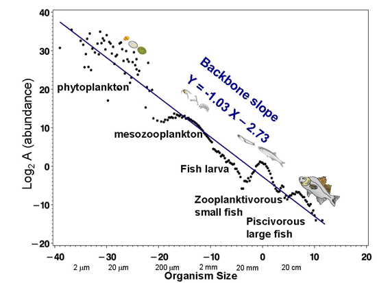 Ecological Effect/Impact. BSS can serve as indicators of multiple stresses to the ecosystem. The individual spectrum for each trophic level (e.g., phytoplankton, zooplankton, fish) may be examined for shape, slope, and intercept and these parameters then used to evaluate factors shaping the size spectra (Kimmel, et al., in review). The importance of bottom-up versus top-down control may be indicated in a size-spectra analysis, thus clarifying how the structure of individual trophic levels is controlled and regulated. Parameters of BSS models can be analyzed with respect to monitored environmental variables. For example, in the case of zooplankton BSS in the Chesapeake Bay, freshwater flow was found to be significantly related to BSS parameters.