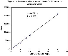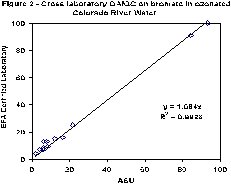 The most significant quality assurance/quality control (QA/QC) issue on this project centers around analysis on bromate, and serves as an example of QA/QC measures undertaken on other parameters. The current MCL for bromate is 10 µg/L, based upon a practical quantification level (PQL). Figure 1 is a standard curve from bromate in nanopure water, and is typical of the results run with each set of bromate samples. The high coefficient of determination signifies reliable calibration over the range of 1 to 25 mg/L. In addition, method detection limits (MDLs) for bromate in nanopure and natural water matrices have been determined. Samples of nanopure and Colorado River water were spiked with 5 µg/L bromate and analyzed nine times, then the MDL was calculated as 3.14 times the standard deviation of the nine samples. The MDL in nanopure water was 1.1 mg/L and 2.2 mg/L in Colorado River water. Due to the high alkalinity and other matrix effects in Colorado River water, this MDL is considered acceptable. In addition to calculating an MDL, duplicate samples of ozonated Colorado River water were sent to an EPA-certified laboratory for bromate analysis. Figure 2 presents results from the cross-laboratory QA/QC study. A slope of near one through the data and a high coefficient of determination indicate excellent cross-laboratory verification of our analysis over a range of bromate concentrations from 1.9 to 93 µg/L.