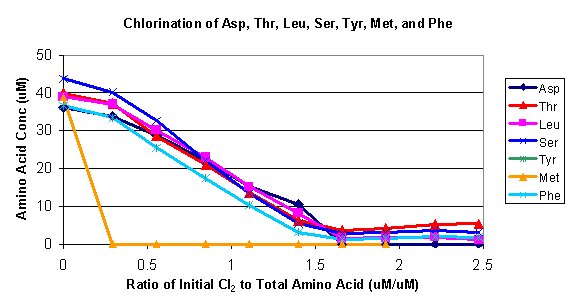 The results of these titration experiments demonstrate that the largest differences in reactivity with chlorine are between those amino acids that contain sulfhydryl groups, methionine and cysteine, and those that do not. Both methionine and cysteine are titrated first and are significantly more reactive than amino acids that do not have sulfhydryl groups. Despite the reactivity of these two substrates, however, the reaction pathway for the methionine and cysteine is likely to involve oxidation of the sulfhydryl sulfur, rather than reaction at the amine nitrogen. Positive identification and the determination of significant yields of methionine sulfoxide upon the chlorination of methionine during these tests is supporting evidence that the initial reactivity of these compounds does not involve steps that lead to cyanogen chloride formation. Limited data in the literature also suggest that methionine and cysteine are typically less abundant amino acids in natural environments.
