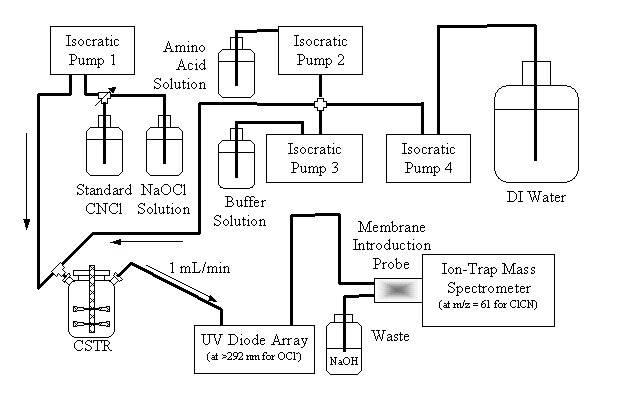 Screening studies to compare the relative yields of CNCl currently are in progress. A continuous flow well-mixed reactor system (CSTR) with online detection of CNCl using membrane introduction mass spectrospectrometry (MIMS) is being used to compare the steady-state concentrations of CNCl. These experiments are being conducted over a range of Cl2:amino acid concentration ratios with the amino acid in excess to minimize effects of CNCl hydrolysis, because the latter reaction is catalyzed by the presence of free chlorine. In this way, relative yields alone can be compared, without the added complexity of CNCl decay. A schematic diagram of the system being used is provided in Figure 2.