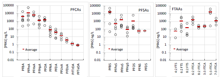 Figure 2. Concentrations (ng/L; log scale) of perfluoroalkyl carboxylates (PFCAs), perfluoroalkyl