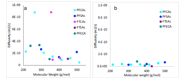 Diffusion experiments with bentonite exhibited rapid breakthrough of PFAS in leachate into through the material and into the unimpacted water in the receiving side of the cell. In bentonite, PFAS breakthrough occurred in Day 1 and was approaching steady state at the end of the experiment (Day 80). Due to low sorption, it was not necessary to account for retardation (i.e., R ≅ 1). Values of Deff were ~9x10-10 (PFPeA, 5:3 FTCA) to ~5x10-11 m2/s (PFDA), generally decreased with increasing molecular weight, and did not show clear trends with functional group (Figure 3a). These values are similar to those measured for volatile organic compounds in prior studies, suggesting that these liner materials will have similar efficacy for PFAS retention.