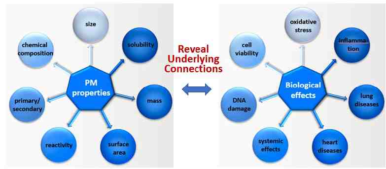 Our goal is to develop a new approach methodology (NAM) and apply this tool to reveal underlying connection between polyaromatic hydrocarbons (PAH) and PAH-derived SOA individually and as mixtures. We strive to reveal relationships between PAH and PAH SOA particulate matter (PM) properties and how they relate to biological effects (Fig 1). This project particularly focuses on biological effects associated with inhalation toxicity that leads to lung tissue injury and lung inflammation. Towards this overall goal, the approach of this project is to develop a NAM that can perform high-throughput dose-response analyses of PAH- and PAH SOA-mediated tissue injury and inflammation.