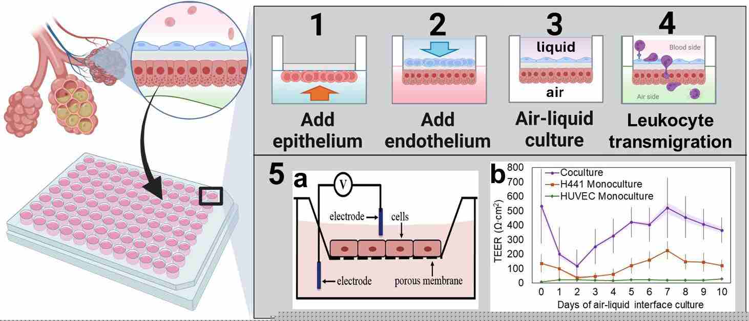 Neutrophilic inflammation assay. 5a) Schematic of TEER. 5b) Co-culture (purple) synergistically enhances TEER compared to endothelial (green) or epithelial (orange) mono-cultures. [Viola et al. 2021, 2025]