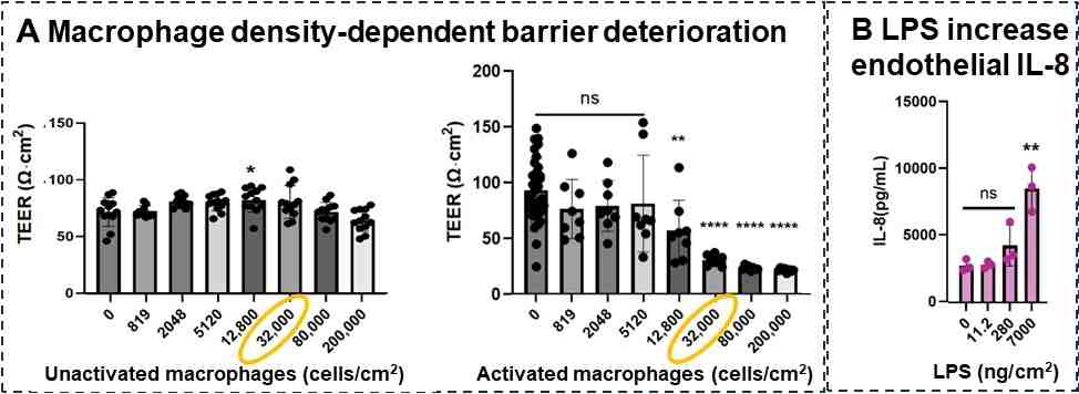 Figure 4. Acutely activated macrophages decrease barrier property within 24 hrs in a macrophage cell density dependent manner. (A) Unactivated macrophages have little effect but activated ones decrease TEER in a macrophage density dependent manner. (B) Airway side stimulation with bacterial endotoxin elicits an inflammatory cytokine response (IL-8) that manifests on the endothelial chamber.