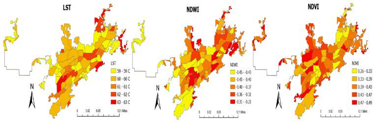 Figure 2. Environmental parameters mapped over Jefferson County. 1. LST; 2. NDWI; and 3. NDVI. (Source: Authors).