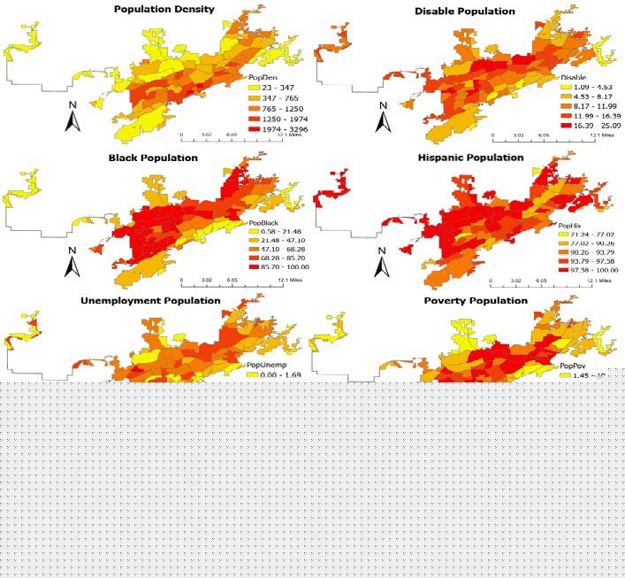 Figure 4. Social parameters mapped over Birmingham City: population with disability; population over 65; population density; Hispanic population; population over 65 lives alone; Black population; unemployment; people without vehicle; and population below poverty (Source: Authors).