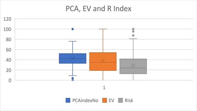 Figure 6. Distribution of PCA, E, and V index values resulted for Birmingham City Census tracts (Source: Authors).