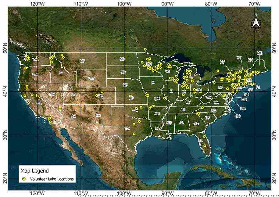 Figure 1. Location of Lakes in the US where samples for perchlorate before and after fireworks were collected by volunteers.