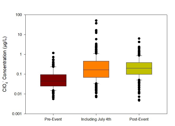 We proposed to evaluate the following hypotheses regarding the impact of fireworks on drinking water sources: 1) Fireworks would have a variable impact on surface water dependent on the mass of fireworks used, the dilution potential (rate and magnitude) of the water source, and the rate of biological perchlorate attenuation; 2) Impact would also depend on the magnitude of both direct deposition onto the water surface and the magnitude of subsequent inputs due to runoff or infiltration; 3) ClO4- concentrations in drinking water sources could be predicted based on fireworks consumption, hydraulic and ecological properties of the drinking water source, and hydrology of the region.