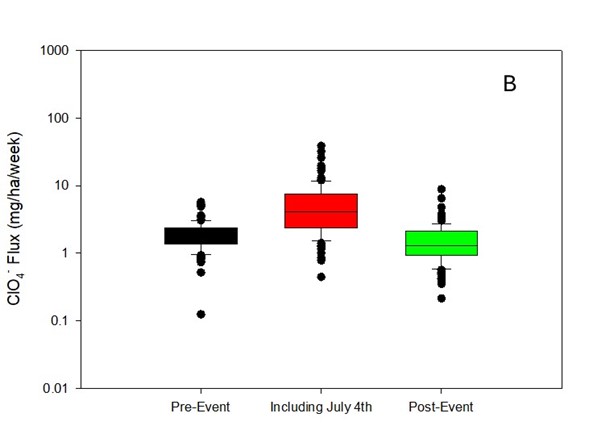We acquired and analyzed wet deposition samples supplied by the National Atmospheric Deposition Program from locations representing 32 states over a 5-year period, with each location providing a sample prior to the week of the 4th, the week of the 4th and a week after the 4th. These sites represent both locations where public fireworks sales are allowed or are illegal, as well as rural and urban settings. We received and analyzed similar samples from the CASTNET program that monitors dry deposition for 28 sites and for two years. There was a significant increase in ClO4- deposition for the week of the 4th of July compared to the period prior and after the week of the 4th (Figure 2). Overall, average wet and dry deposition rates across the entire US increased by 300% during the 4th of July week, presumably due to fireworks use. Urban areas were more impacted than remote. The detailed analysis of this data set was ongoing when the grant was terminated. Research had been planned to use these deposition rates to model surface water concentrations, but this was not accomplished due to the grant being terminated.