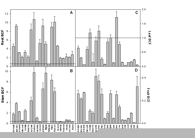 Figure 1. Vegetation-to-Soil Bioconcentration Factors for 10 Cultivars of C. pepo ssp pepo and C. pepo ssp texana