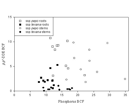 Suprisingly, DDE content varied significantly within the tissues of C. pepo cultivars (see Figure 1). Root-to-soil bioconcentration factors ([BCF], dry weight contaminant concentration ratio of tissue to soil) ranged from 0.57 to 11 and stem to soil BCFs ranged from 0.04 to 9.8. However, much of the variability was explained by the subspecies-level dichotomy. For example, the average root and stem BCFs for DDE by ssp pepo were 7.4 and 5.4; the values for texana were 2.4 and 0.54, respectively (significantly different at p<0.01), respectively. The two subspecies also differed in total amount of DDE phytoextracted; pepo cultivars removed nearly five times more contaminant than texana cultivars. Lastly and perhaps most importantly, the two susbspecies also differed in their ability to remove phosphorus (P) from the soil. As predicted by our hypothesized relationship between P acquisition and POP phytoextraction, ssp pepo was significantly more efficient at removing P from the soil (see Figure 2). Interestingly, pepo cultivars removed several inorganic elements from the soil to a greater extent than ssp texana, including Cd and Zn. In fact, one pepo cultivar had a leaf BCF for cadmium (Cd) of 38 (although this soil had only background levels of the element); a value on the order of many known Cd hyperaccumulators.