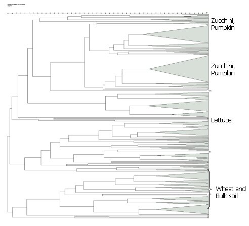 Figure 3. Dendrogram From Box-PCR Data for Isolated Anthracene-Degrading Organisms From the Rhizopshere of Zucchini, Pumpkin, Lettuce, Wheat, and Bulk Soil
