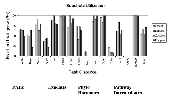 A second fundamental question focuses on the degradative range of these individual isolates. Presumably, condensed PAHs are not their preferred carbon and energy source. It has been hypothesized that aromatic root exudates may actually prime these organisms for degrading the PAHs, and may potentially be involved in the selection process described in the preceeding paragraph. A colorimetic well type system was used to investigate the ability of the anthracene and chrysene-degrading isolates to degrade a number of other PAHs, aromatic root exudates, phytohormones, and pathway intermediates. The results are shown in Figure 4 and indicate that the degradative range of these organisms is indeed quite broad.