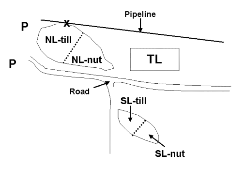 Semi permeable membrane devices (SPMDs) (2.54 cm x 5.08 cm, 0.0556 g triolein, Environmental Sampling Technologies (EST), St. Joseph, MO) were received from the manufacturer in hexane-rinsed, sealed, tin cans. An initial deployment of SPMDs was conducted to examine whether any accumulation of hydrocarbons would occur. If no hydrocarbon accumulation were observed during the preliminary deployment, no further SPMD deployment would be conducted. The preliminary deployment was conducted in late June-early July 1999. Two SPMDs were deployed in the NL-till area closest to the point of the pipeline break to ensure maximum petroleum hydrocarbon exposure from the soil. SPMDs were deployed by simply digging a hole with a shovel, breaking up the soil clod into smaller fragments and then placing the SPMD flat in the bottom of the hole. All handling of SPMDs was conducted using clean latex gloves. The SPMDs were placed at a depth of approximately 15 cm and gently covered with the soil that was removed in the preparation of the hole. The soil was gently compressed into the hole in order to avoid possible damage to the SPMDs. An orange strip of flagging tape long enough to extend above the soil surface once the SPMD was buried was attached to each SPMD. A one-foot square area around the hole for each SPMD was marked with four orange flags for ease of location. The SPMDs in the preliminary trial were left in place for a period of 14 days.Figure 1: Map of the Tallgrass Prairie preserve study site. Legend: NL-till - North lobe of spill, straw tilled in; NL-nut - North lobe of spill, nutrients added; SL-till - South lobe of spill, straw tilled in; SL-nut - South lobe of spill, nutrients added; TL - prairie control tilled with the addition of straw; P - prairie control areas; X - site of pipeline rupture that created the spill