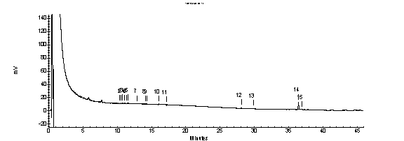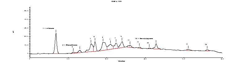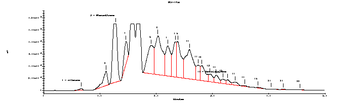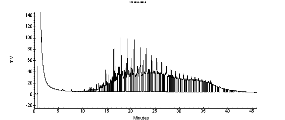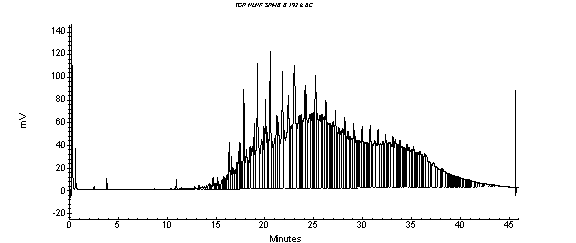 Figure 4: TGP North Lobe Composite TPH - 2780 mg DRO/kg soil [10 g soil (4 mm sieved, as received), 25 mL MeCl2 (Fisher - Optima Grade), 15 min sonication @ 60% duty cycle, 15 ml recovered and concentrated to 2 mL] DRO - Diesel Range Organics C10-C28 (12.5 - 33.5 min)