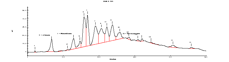 Preliminary deployment of SPMDs in the NL-till section of the spill area accumulated detectable levels of the PAHs aromatic hydrocarbons phenanthrene (3.7+-3.6, Mean+-SD, n=2) and bezo[a]pyrene (2.5+-1.8, Mean+-SD, n=2) (Figure 2). SPMDs deployed in prairie reference areas contained no detectable hydrocarbons. Upon removal of the SPMDs from the NL-till area, it was noted that the SPMDs had a greenish-yellow tinge to them rather than being completely clear. Based upon these results, it was decided to conduct the deployment of a full complement of SPMDs in the test area. On July 28, bison that have been re-introduced to the Tallgrass Prairie preserve were observed walking on and taking dust baths on the areas where the SPMDs were deployed. The condition of the sampling area was checked on August 6 to determine if any severe damage had been inflicted on the sampling devices. Although flags were missing from some of the SPMDs in the areas that were tilled and received nutrients, it was decided that the SPMDs would be left undisturbed for the duration of the deployment period. When SPMDs were retrieved from the study area, it was found that only 14 of the 22 SPMDs deployed were still intact and suitable for dialysis and GPC. The remaining eight had been ruptured by the walking and rolling of bison in the study area. Analysis of the dialysates from the SPMDs deployed in the North lobe showed that there were no PAHs detectable by HPLC analysis. Further analysis of these samples by GC/MS found detectable levels of C12 hydrocarbons. The results of the definitive SPMD deployment are disappointing given that PAHs could be detected in SPMDs from the preliminary deployment. One reason for this difference could be environmental conditions in the study area during SPMD deployment. During the preliminary deployment, heavy rains were present, saturating he ground and resulting in pooled water on the study site. Very little precipitation was present during the definitive deployment, resulting in SPMD exposure during dry conditions. Since uptake of nonpolar chemicals by SPMDs is by diffusion, extremely wet conditions resulting in the immersion of the SPMD in a saturated soil would enhance hydrocarbon uptake, while dry conditions would be as favorable for diffusive uptake. Further research must be conducted to examine the effects of various environmental conditions on chemical uptake by SPMDs if they are to be used in screening for available chemical levels in field situations.Analysis of hydrocarbon-contaminated soils by solid-phase microextraction (SPME) techniques has not yet been completed. Adaptation of the technique of Parkerton and Stone (1998) has taken much longer than expected. Baseline parameters such as fiber equilibration time with the soil sample (96 h) have been established and a set of standards have been developed to allow for the interpretation of SPME data. Initial analysis of a soil sample from the NL-till area is presented in Figure 3 for comparison to a TPH by GC analysis of the same soil (Figure 4). TPH by GC analysis of a prairie reference soil (Figure 5) is also presented for comparison. The method for the comparison of exposure dose between the SPME approach and TPH analysis will be to compare quantitatively and qualitatively the area under the curve for diesel range organics (DRO - C10-C28). SPME analysis of soils for bioavailable petroleum hydrocarbon (BPH) differs from TPH in two ways. Quantification of detectable hydrocarbon by SPME analysis (BPH) suggests that approximately 1% of TPH is actually present in a phase detectable by SPME. Additionally, SPME analysis appears to have a slightly lower sensitivity for hydrocarbons in the lower MW range for DRO (Figure 2) as compared to TPH by GC analysis (Figure 3).