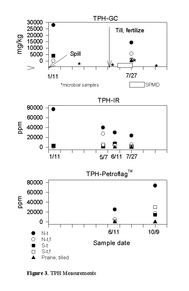 In general, TPH levels decreased over the course of the season, as expected (Figure 6), with the exception of the Oct. 9 Petroflag( samples. Soil samples collected shortly before tilling and fertilizer application took place confirm that there was no contamination with brine (Table 1). Heterogeneity of the distribution of oil prevents strict comparisons between soils sampled at different times using alternative methods of measuring TPH levels, nevertheless, the discrepancy between the Oct. 9 levels measured by Petroflag(, and those expected from continuing the downward trend seen with GC and IR, make us hesitant to recommend the exclusive use of Petroflag( for TPH measurements at this time in spite of its low cost and rapidity. Once SPME analysis of soils for bioavailable petroleum hydrocarbon (BPH) is completed, it may become evident that BPH may be a useful tool in monitoring not only the bioavailable hydrocarbon, but also general trends in hydrocarbon levels in soil.