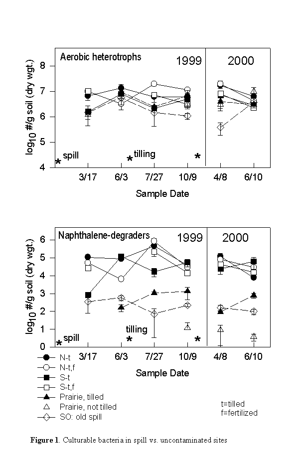 The numbers of hydrocarbon-degrading bacteria, represented by aerobic heterotrophs capable of growth on naphthalene, were elevated in comparison to samples taken from the tilled, uncontaminated prairie and a nearby aged spill site over the period from March 1999 to June 2000 (Figure 7). Similar trends were observed in previous studies of crude-oil contaminated sites in the Tallgrass Prairie (Duncan et al. 1999). Simply measuring numbers of aerobic heterotrophic bacteria, without specifically examining naphthalene-degrading bacteria, suggests no differences or trends between sites.