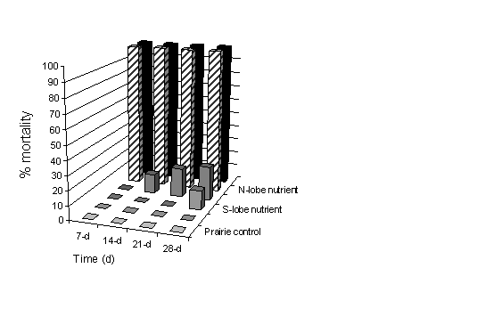 Toxicity tests conducted with earthworms (Eisenia fetida) show that levels of hydrocarbons in the soils were sufficient to cause mortality. Complete mortality of earthworms exposed to soils from the North lobe occurred in less than seven days (Figure 8). Although soils from the South lobe were less toxic, 13-27% mortality was observed in these treatments as well, suggesting that sufficient hydrocarbon was present to cause lethal effects. No mortality was observed in prairie reference and tilled reference soils. Cocoon production was evident only in the two reference soils and in soil from the South lobe-nutrient treatment. Cocoon production was greatest in the tilled reference area, with lower, but consistent numbers of cocoons in the prairie reference soil. Cocoons were only produced in one replicate of worms exposed to South lobe-nutrient soils, suggesting less than optimal conditions for cocoon production.
