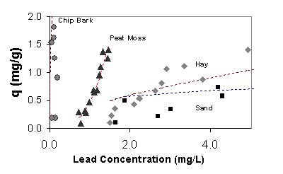 The first objective is nearing completion; analyses by scanning electron microscope are underway. Results reveal that three mechanisms dominate metals removal in the wetlands. The three removal mechanisms are: (1) adsorption, primarily to organic substances in the wetlands; (2) co-precipitation with iron oxyhydroxides; and (3) precipitation as metal sulfides. The relative importance of and removal by these three mechanisms will vary from wetland to wetland, based on: media selection, influent water composition, and biological activity in the wetland. Adsorption characteristics for different wetland substrates can vary greatly, given the wide range of materials that have and can be used. We determined individual Langmuir isotherms for the materials used in the laboratory-scale wetlands (see Figure 1). From these isotherms, the sorption capacity and breakthrough times for lead and zinc were predicted. Breakthrough times for the laboratory-scale wetland ranged roughly from 3 to 74 years. We developed predictions, assuming 100 percent sorption efficiency and no competing removal mechanisms. Second-order kinetics relationships also were developed, allowing for approximation of the rate of removal by sorption. To better ascertain what the relative importance of adsorption is in the laboratory wetland, we passed a 1M MgCl2 solution through a wetland to remove zinc and lead sorbed after 52 months of operation. Effluent sampling showed that roughly 13 percent of the lead and 5 percent of the zinc in the wetland were desorbed during the desorption experiment. Based on the specific materials used, this approach can be applied to constructed wetland designs, while predicting the sorption capacity for an individual design.