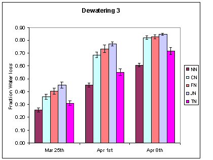 Figure 1. Third Dewatering Cycle. On March 18, all pots were at the saturation point, or with 0 as the fraction lost. NN = no plants, CN = C. aquatalis, FN = S. pectinata, JN = S. fluviatilis, TN = T. dactyloides.