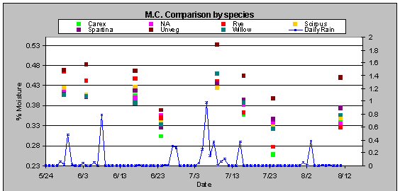 The three wetland species were able to remove the greatest amount of moisture from the sediments. The S. fluviatilis had the lowest percent moisture as compared to the other wetland plants. S. fluviatilis is a species typically found actually growing in standing water, so it would make sense that this plant would not have had selective pressure to reduce water loss through transpiration. Transpiration rates are illustrated further in Table 1.