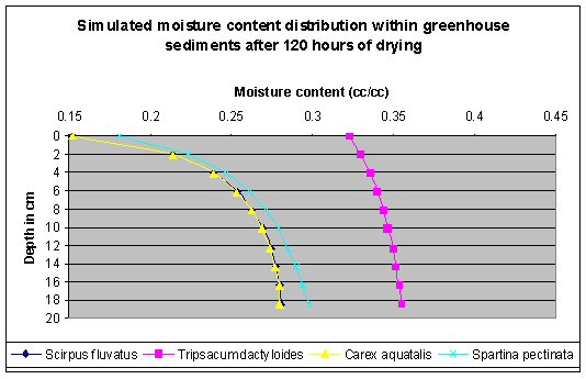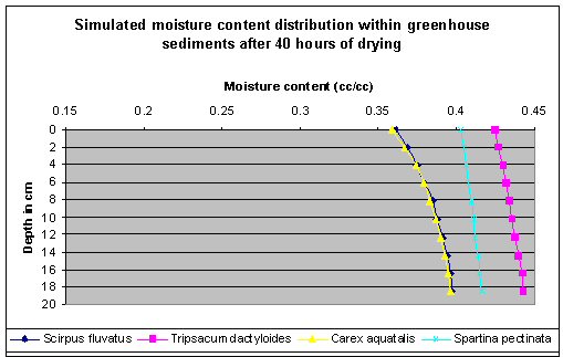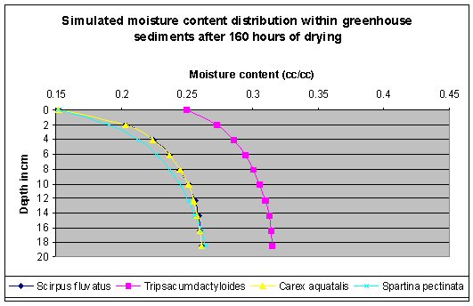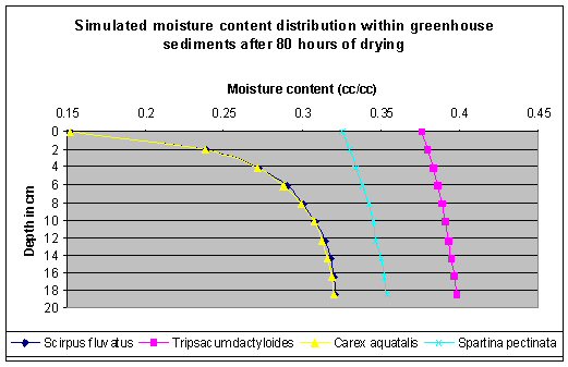 Simulation Results. The unsaturated flow model was used to simulate dewatering of Milwaukee sediments using wetland species in greenhouse studies at Purdue University (Ms. Euliss Katy, the graduate student provided the experimental data). The sediments were dewatered using S. pectinata, C. aquatalis, T. dactyloides, and S. fluviatis.