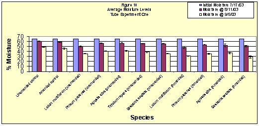 Results. In our results, we are interested in screening those plant species that have the greatest moisture loss as a function of root growth and still are able to maintain a high rhizosphere bacteria population. The results in Figure 9 show that the greatest microbial populations were sustained by A. alba in the unamended tube, with a count of 1.02 E9 bacteria. S. exaltata and L.lium multiflorum had the second (9.01 E8) and third (8.75 E8) highest microbial counts in the amended tubes, respectively. With the exception of A. alba, microbial populations followed as expected in the growth tubes, with counts generally higher in the amended tubes. The greatest moisture loss, shown in Figure 10, was exhibited by S. exaltata (final sediment moisture of 28.53 percent) followed by L. multiflorum (final sediment moisture of 30.41 percent). S. exaltata and L. multiflorum also had the greatest root growth in both the unamended and amended tubes (see Figure 11). Root growth was observed along the full length of the growth tubes (88.9 cm) in both species, except for the amended tube containing L. multiflorum. Overall, S. exaltata and L. multiflorum exhibited the best results in dewatering and sustaining the highest bacteria populations in the contaminated sediments at all depths.