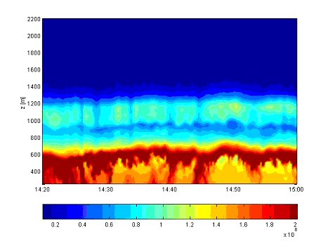 Figure 2. Lidar Time Series of Relative Aerosol Concentration for a Height Range z From 250 m to 2,200 m (Arbitrary Units) Demonstrating ABL Entrainment