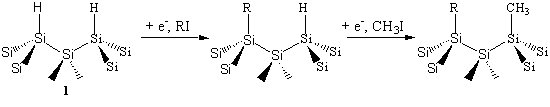 In the current period of funding, our work has focused on surface functionalization as a means to enhance the binding of the chromate and arsenate anions to porous silicon, and to stabilize the material against oxidation in air and water environments. In the present funding period, we showed that the chemical stability of porous silicon can be increased by replacing residual Si-H species on the surface with methyl groups (see Equation 1). Reacting a previously modified surface with a smaller reagent to "cap off" sites left unreacted by larger moieties has been used successfully in the synthesis of silica-based packings for reversed-phase chromatography. We found that functionalized porous silicon surfaces can be reductively coupled with iodomethane (CH3I), resulting in the replacement of most of the remaining Si-H bonds. The high degree of surface coverage obtained by methylation has been previously reported, but the extension to mixed surfaces has not been explored. Several experiments designed to quantify the stability of the modified porous silicon samples were performed, involving the use of chemical oxidants and solutions that mimic those used in bioassay applications or that might be encountered in environmental sensor applications.