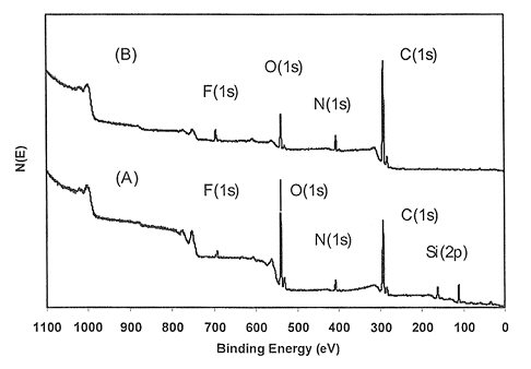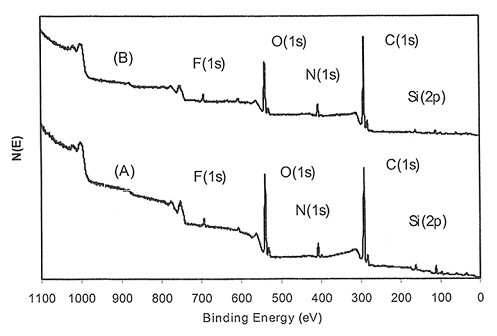 Figure 11. XPS Survey Spectra of the (A) Substrate and (B) Adhesive Failure Surfaces of Joints Prepared Using the Two-Part Adhesive and Aluminum Substrates That Were Etched in an O2 Plasma and Coated With High-Hydroxyl Plasma-Polymerized Silica-Like Films