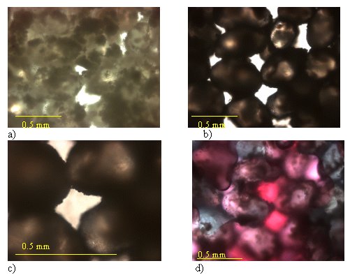 Figure 2. 10 percent montmorillonite in sand micromodel showing: (a) dry, (b) water saturated, (c) clay/grain surface enlarged, and(d) PCE in the pore space.