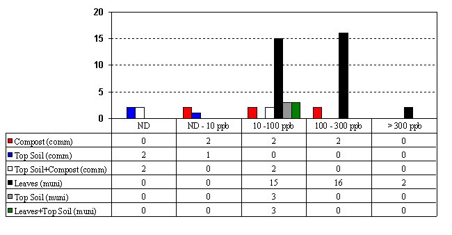Most previous investigations of POPs have focused on non-point sources as contributors to POPs cycling through the environment, for example, soil-to-air and water-to-air routes. In contrast to these previous studies, one aspect of the current project is the investigation of a point source, compost, and its anthropogenic translocation, as a contributor to POPs cycling through the environment. Thirteen commercial compost samples were purchased, and thirty-nine samples of municipal composts were collected from facilities across the state. The total chlordane concentration (expressed as TC+CC+TN on a dry weight basis) for six compositional categories of compost is shown in Figure 1. From this histogram, we make the surprising observation that soil as a compost feedstock does not appear to make a major contribution to the chlordane concentration in the final product; leaves, on the other hand, do appear to be a major source of chlordane. A manuscript on this compost study with detailed information regarding component and chiral chlordane fractions is now in preparation.