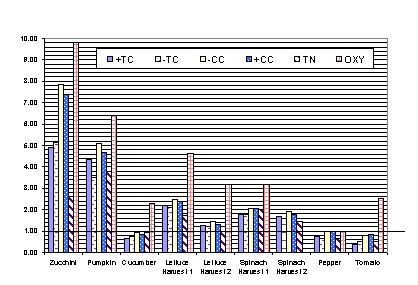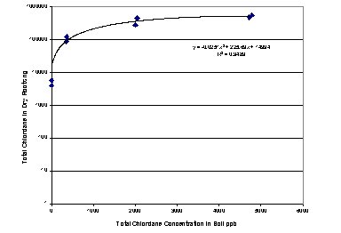 Zucchini was grown in soil containing four different concentrations of chlordane in bins that were positioned in the field without contacting the field soil itself. To date, the chlordane component concentrations have been determined in the soil before and after planting, and in the zucchini roots. Concentrations in the stems, leaves, and fruit remain to be determined. The soil/root data permit a dose/response to be estimated as shown in Figure 3. The complete data set from the field 2001 dose/response study will be used in the design of dose/response experiments to be conducted in growth chambers in the coming several months.