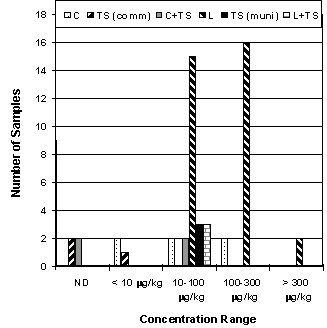 Figure 1. Distribution of Chlordane in Compost Samples. C, containing organic and manure compost; TS (comm), containing topsoil and/or sand; C + TS, containing a mixture of compost and topsoil; L, leaf and/or wood chip compost; TS (muni), primarily topsoil; L + TS, a mixture of leaf compost and topsoil-sand.