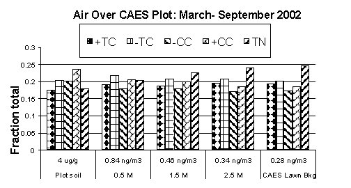 Soil-to-Air Flux. Collection of atmospheric samples for determination of chlordane concentration has been extensive throughout the grant period. From June 2000 through September 2002, ambient air samples were collected periodically at three heights (0.5 m, 1.5 m, and 2.5 m) above the experimental plot on the Connecticut Agricultural Experiment Station (CAES) campus. This plot is well documented with regard to chlordane treatment and subsequent history. In addition, air samples were collected throughout this period at a single height at a background site, approximately 25 m distant from the treated plot on the CAES campus. From May 2001 through September 2002, a suburban site, Lockwood Farm in Hamden, CT, the experimental farm belonging to CAES, was monitored. Two additional background sites were monitored from March to September 2002; the first, an urban site in downtown Waterbury, CT; and the second, a rural site at a fish hatchery in Burlington, CT. The data we have collected represent the first long-term study of the ambient air above contaminated soil. The duration of the study allows additional insight into the volatilization process previously unavailable. The data also permit the comparison with chlordane concentrations in ambient air at alternate sites. A small portion of the data is summarized in Figures 2 and 3.
