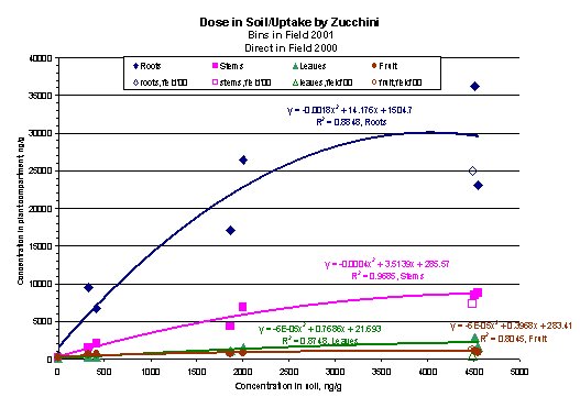 Broader Implications of the Data from the Soil-to-Plant and Air-to-Plant Dose Uptake Routes. The POPs uptake capability of C. pepo L. is exceptional. As a result of our studies completed through the funding from this grant, we have begun to investigate the uptake mechanisms that produce these observations. Our laboratory has received a grant for these phytoremediation studies. In addition, several additional grants to extend the phytoremediation investigations begun under U.S. Environmental Protection Agency (EPA) Star Grant No. R828174 are pending.