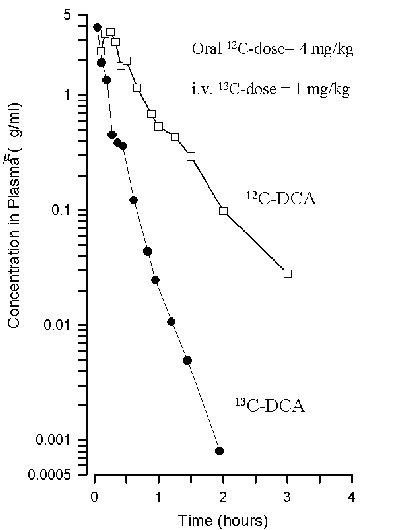 In this example, the oral bioavailability of DCA was calculated to be 73 percent. Based on the results of these pilot studies, we are ready to begin volunteer studies with DCA using an administered dose having a 12C/13C ratio of 3:1 and 5:1.