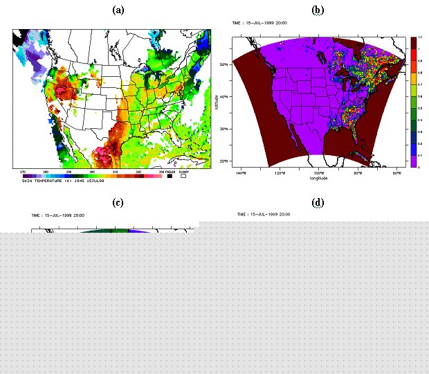 Figure 1. Results for July 15, 1999, at 20:00 GMT. (a) Satellite retrievals of skin temperature; (b) adjusted moisture availability field; (c) model skin temperatures from control simulation; (d) model skin temperatures from satellite assimilation run.