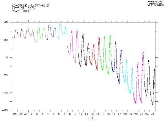 The 8-km simulations crashed around July 20. Investigating the cause of the crash, we realized that at certain locations earlier in the simulations, the skin temperatures started to deviate sharply from their normal trend. As the simulations continued, the error increased and propagated to adjacent areas. Finally, the model crashed at a later time in the simulation. Figure 2 shows the results from two grid points over the southeast that exhibited unrealistic behavior. As the figure shows, the skin temperatures start to show large diurnal oscillations after July 7, and by July 23, the skin temperatures are either unrealistically warm (in one case) or cold (in another case).